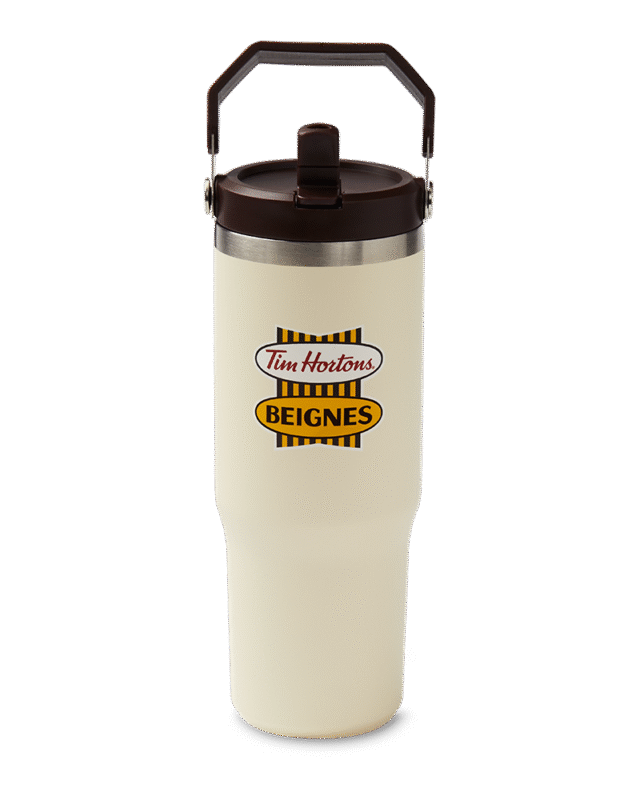 Stay hydrated with our biggest tumbler yet. The Tim Hortons 40oz Stainless Steel Tumbler is vacuum insulated to keep your favourite drinks cold up to 24 hours. The lid has 3 positions for straw. sipping. and closed. Available in multiple colors. Save $0.10 on refills. offer valid in Canada only. Terms apply. Visit restaurant for details.
